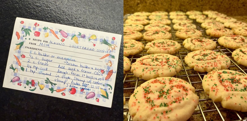 As a little girl I would wait with great anticipation for my favorite Christmas treat made by my mom…Almond Shortbread Cookies. The crinkly edges that formed from pressing the dough ball down, the light coating of granulated sugar and then the red and green sprinkles that added a bit of joy and wonder. These were the special, magical touches that I’d dream about and wait for each December as a young child. The cookies served as a “marker” if you will, of the joy and anticipation of the season.